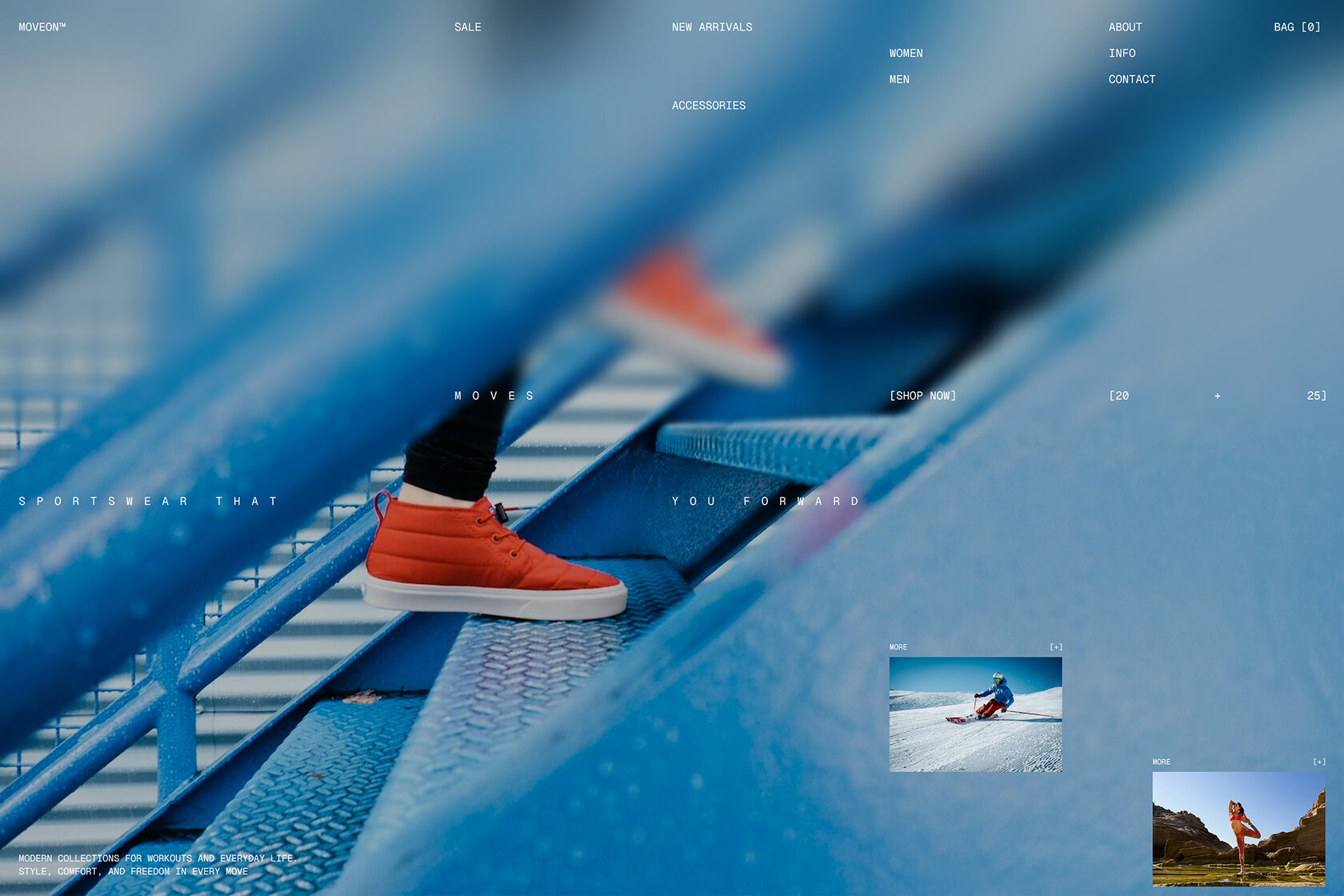 The design of the MoveOn sportswear website combines dynamic visuals with intuitive navigation, creating a complete user experience that immerses visitors in a sense of movement and style. The focus is on clean forms, contrasting elements, and an easy-to-navigate structure.